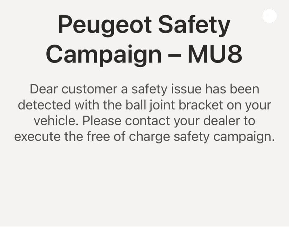 Οι κάτοχοι του νέου 3008 (P64) και 5008 (P67) να κάνουν ένα πρώτο έλεγχο στη εφαρμογή τους (my peugeot) για να δούν αν υπάρχει κάποια ενημέρωση σχετικά με την καμπάνια της ανάκλησης MU8, η οποία αφορά την ασφάλεια του αυτοκινήτου.
